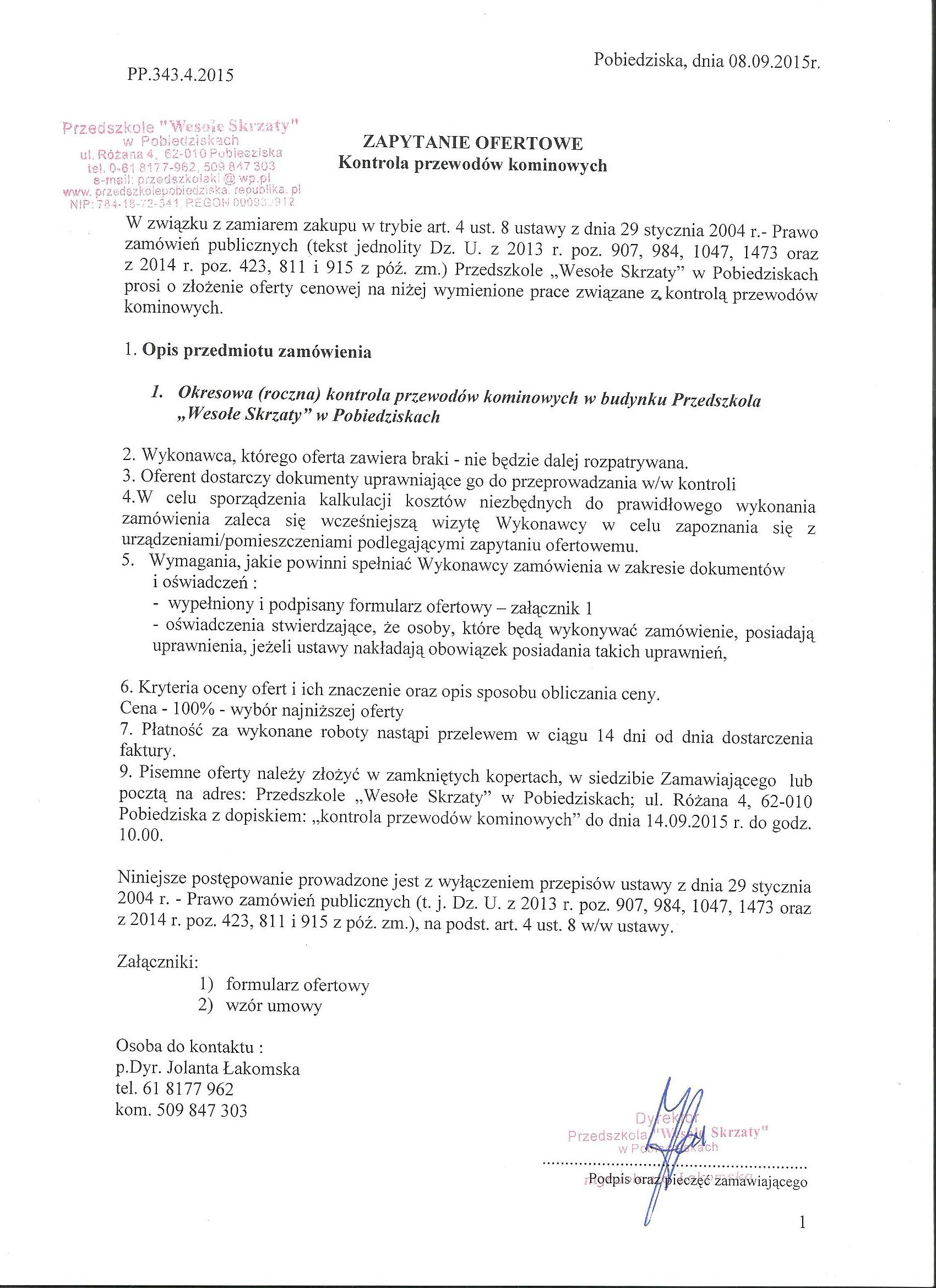9. Pisemne oferty należy złożyć w zamkniętych kopertach, w siedzibie Zamawiającego lub pocztą na adres: Przedszkole „Wesołe Skrzaty” w Pobiedziskach; ul. Różana 4, 62-010 Pobiedziska z dopiskiem: „kontrola przewodów kominowych” do dnia 14.09.2015 r. do godz. 10.00.