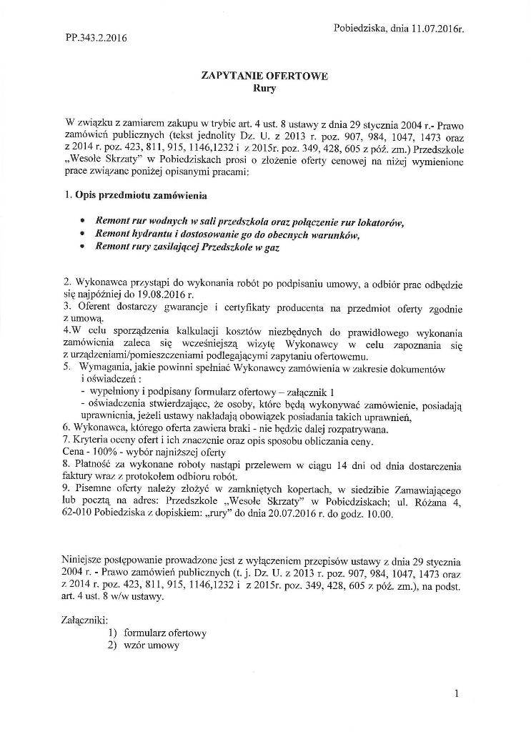 9. Pisemne oferty należy złożyć w zamkniętych kopertach, w siedzibie Zamawiającego lub pocztą na adres: Przedszkole „Wesołe Skrzaty” w Pobiedziskach; ul. Różana 4, 62-010 Pobiedziska z dopiskiem: „rury” do dnia 20.07.2016 r. do godz. 10.00.